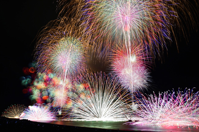 熊野市で行われる大花火大会。水面で大玉を爆発させる海上自爆が有名。