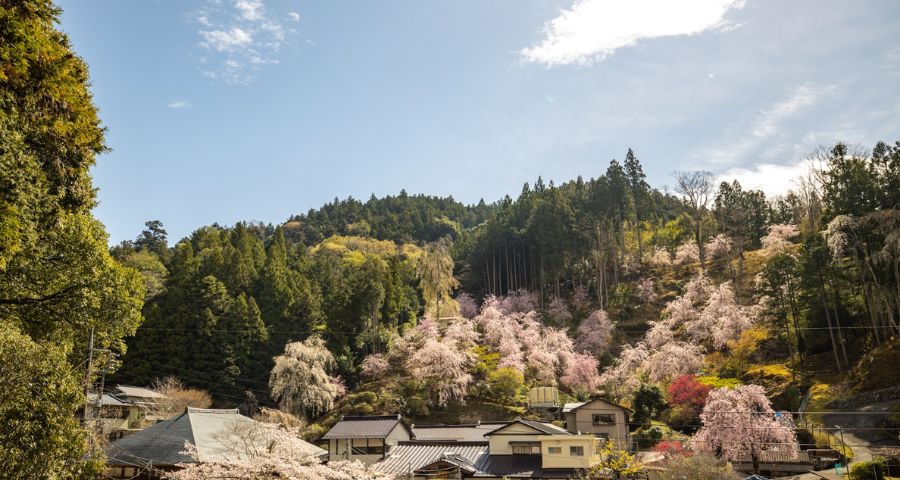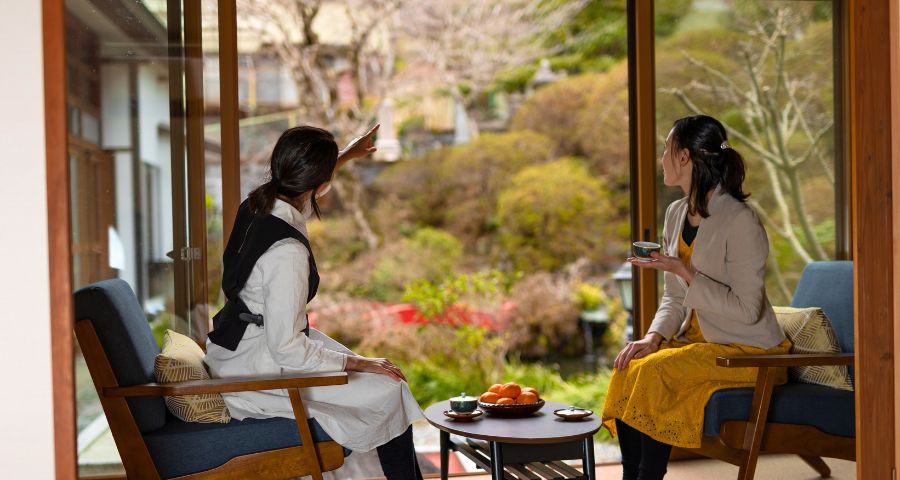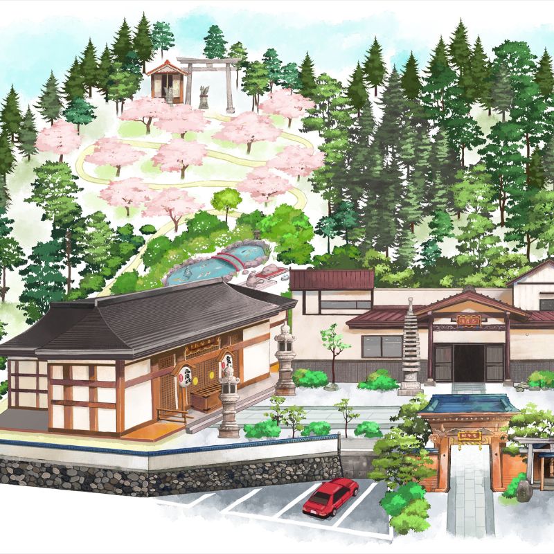 There are various areas within the facility, including a lounge, dining room, and garden. The mountain behind the lodging house is lined with cherry blossom trees, and there is a promenade leading to the shrine at the top of the mountain.