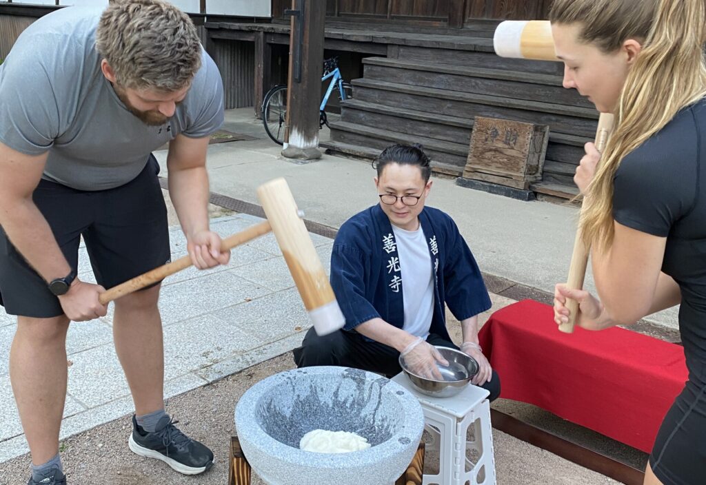 Learn to make mochi in a temple in Takayama. Pound rice with a wooden mallet, shape the dough, and enjoy it with toppings. Discover the cultural significance of this Japanese tradition.